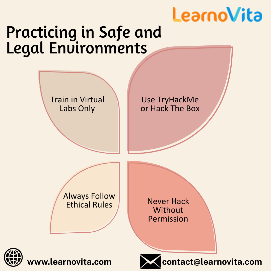 Before applying your skills in real-world situations, you should sharpen them in legal, controlled environments. Platforms like Hack The Box, TryHackMe, and OverTheWire are designed to mimic real-world attack and defense scenarios. These labs provide a hands-on experience that lets you experiment, make mistakes, and improve without consequences. They’re ideal for learning the art of ethical hacking in a risk-free setting. Our Best Training & Placement Program ensures hands-on learning and career support, guiding you from skill-building to securing your dream job.